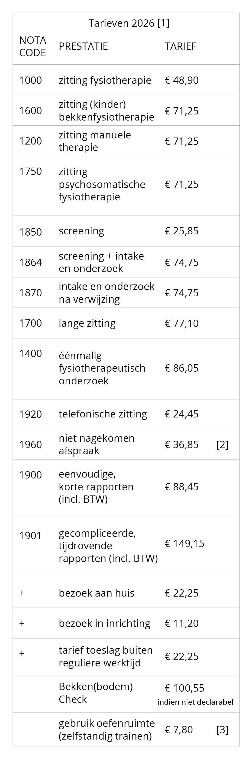 [1] Deze praktijktarieven worden in rekening gebracht, indien wij de behandeling niet kunnen declareren bij uw zorgverzekeraar; dat vindt plaats indien u niet aanvullende verzekerd bent, of indien u geen recht meer heeft op vergoeding vanuit uw aanvullende verzekering (overschrijding max. aantal behandelingen of max. budget) of als wij geen contract hebben met uw verzekeraar.